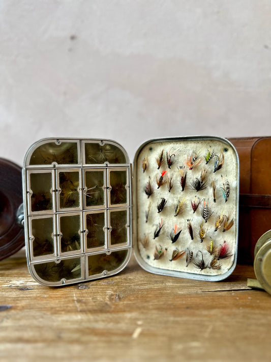 Vintage Aluminium Fly Fishing Box with Hand-Tied Flies