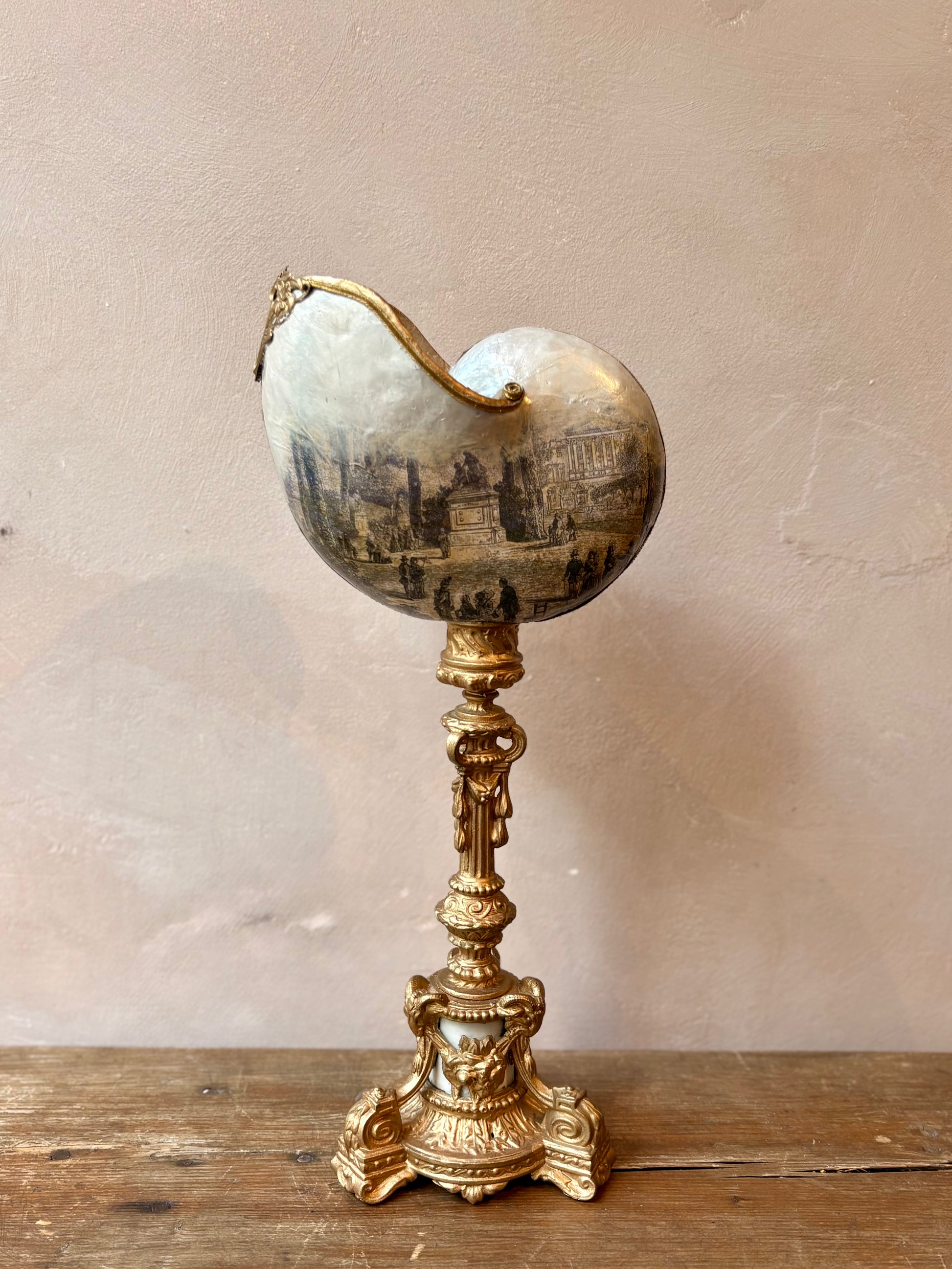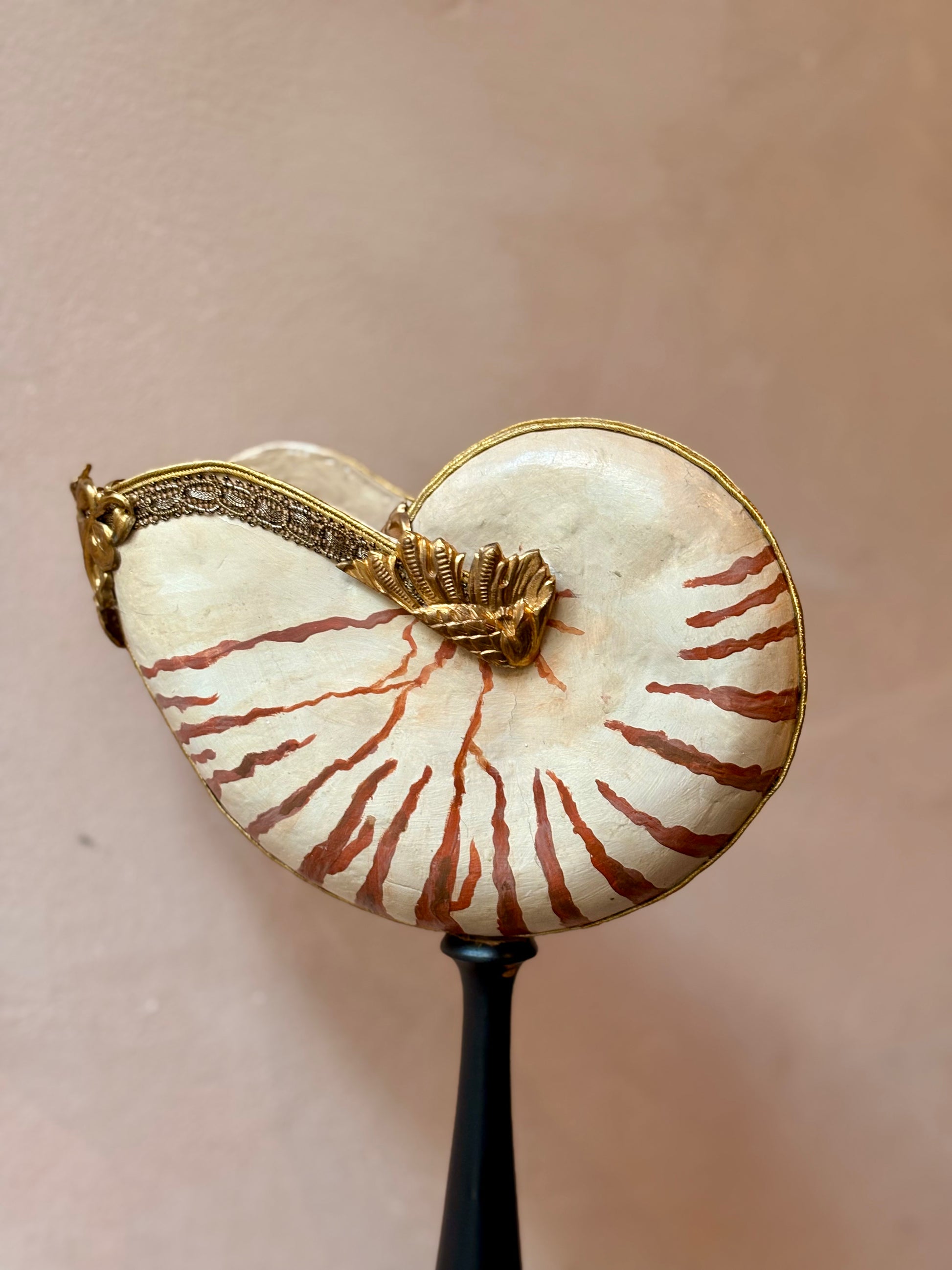 This hand-painted papier mâché nautilus sits elegantly atop a Napoleon III pedestal, giving off an air of Parisian attic-find sophistication. Also inspired by the Age of Exploration, it carries whispers of forgotten voyages and old-world collectors who arranged seashells like crown jewels. (Dimensions: 36cm tall)