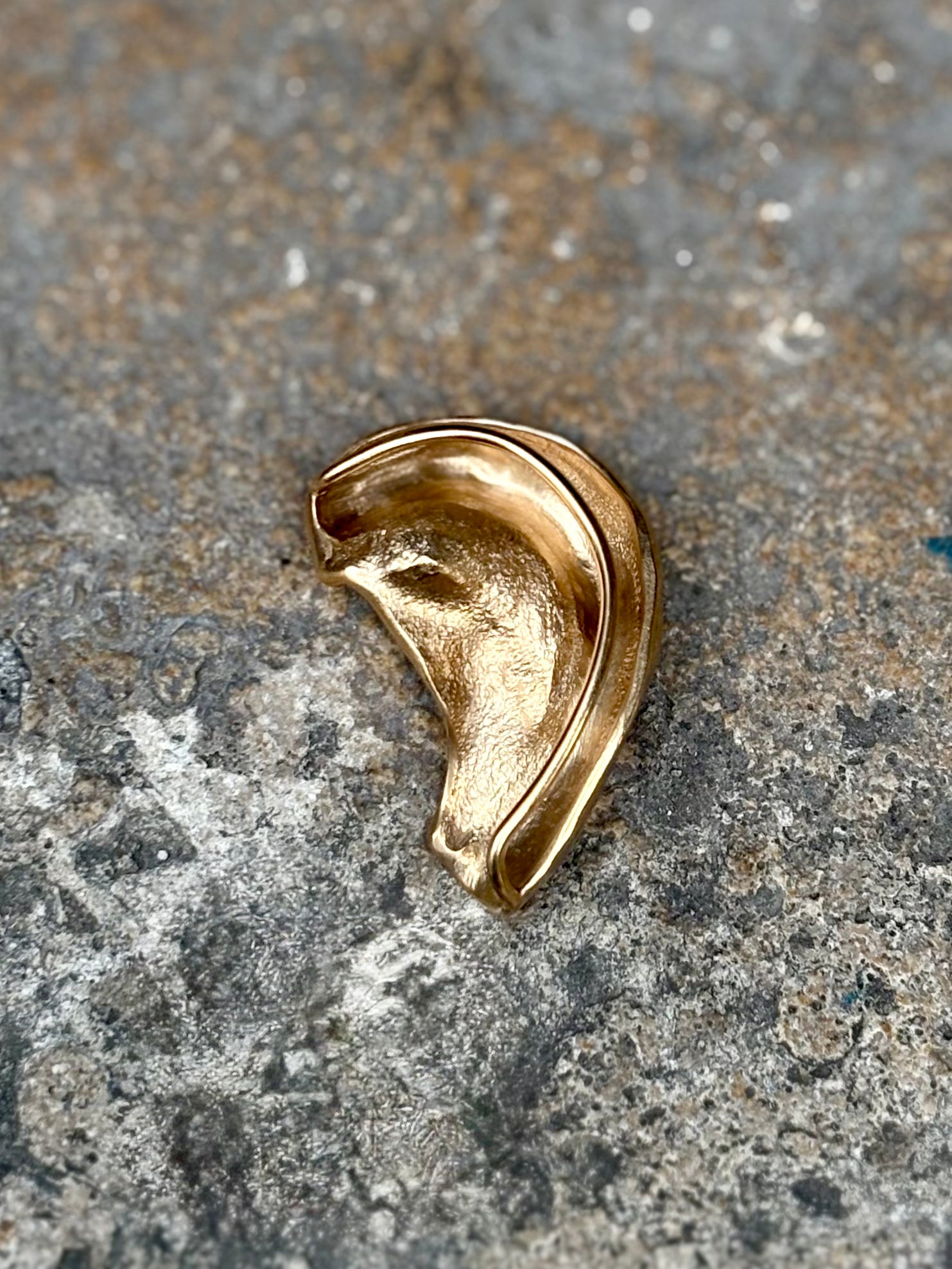 Cast to resemble a folded, expressive ear form, the piece curves organically along the ear, appearing almost grown rather than worn. Its textured surface and asymmetrical silhouette echo Schiaparelli’s signature play between the body and the imagination — the boundary where fashion becomes art.