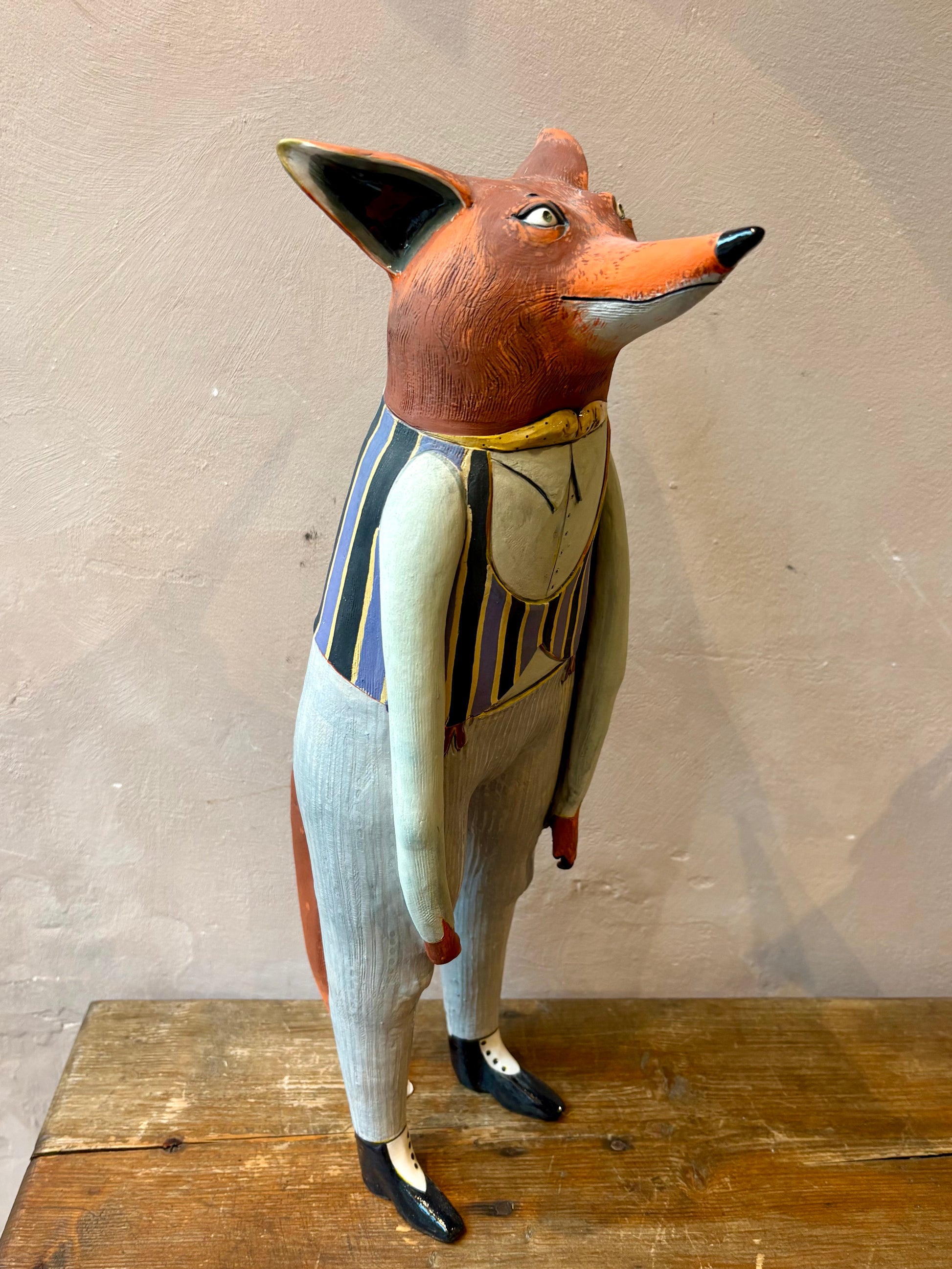 A dapper, hand-painted fox sculpture dressed in his Sunday best — striped waistcoat, high-collared shirt, and polished two-tone shoes. With a charmingly aloof expression and impeccable posture, he looks straight out of a Beatrix Potter story or a Wes Anderson film.
