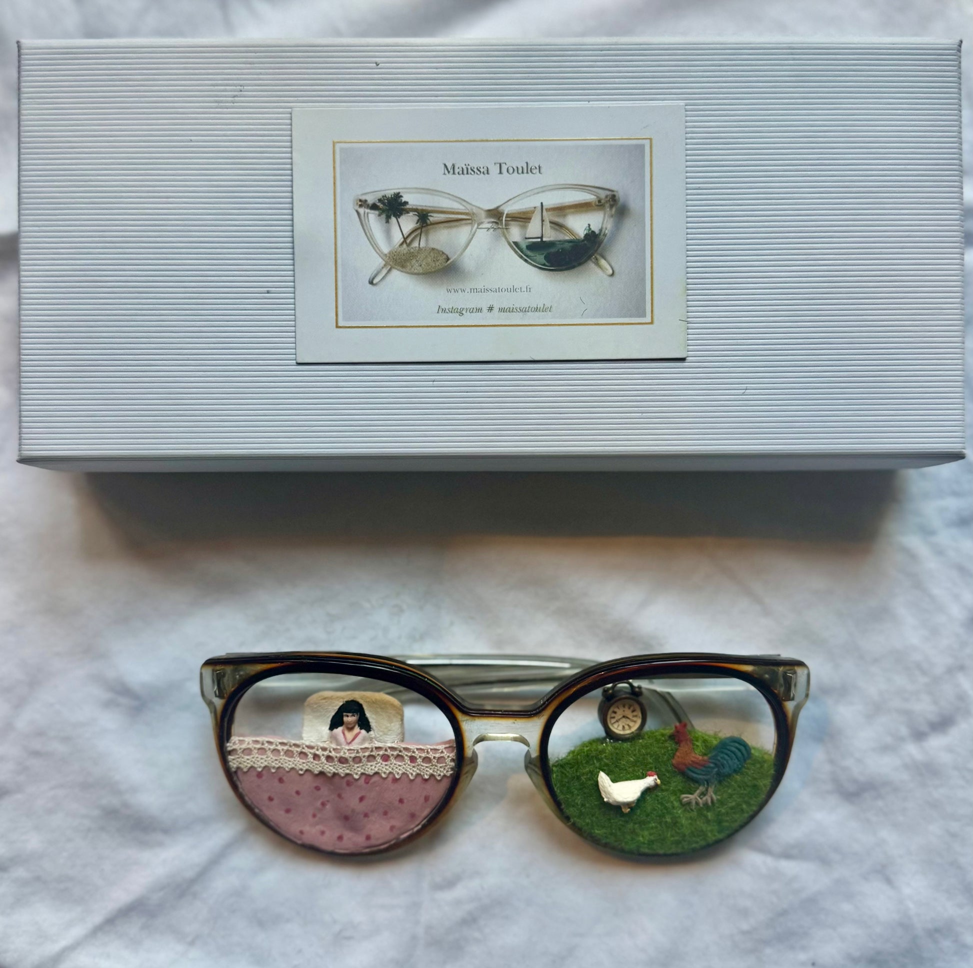 Each pair of glasses in this collection is created using vintage French frames sourced by the artist, meticulously enhanced with handmade details. Each piece uniquely captures its own story, blending nostalgia with artisan craftsmanship. Signed by artist to complete your curiosity cabinets for display on bookshelves or to be mounted on a wall.