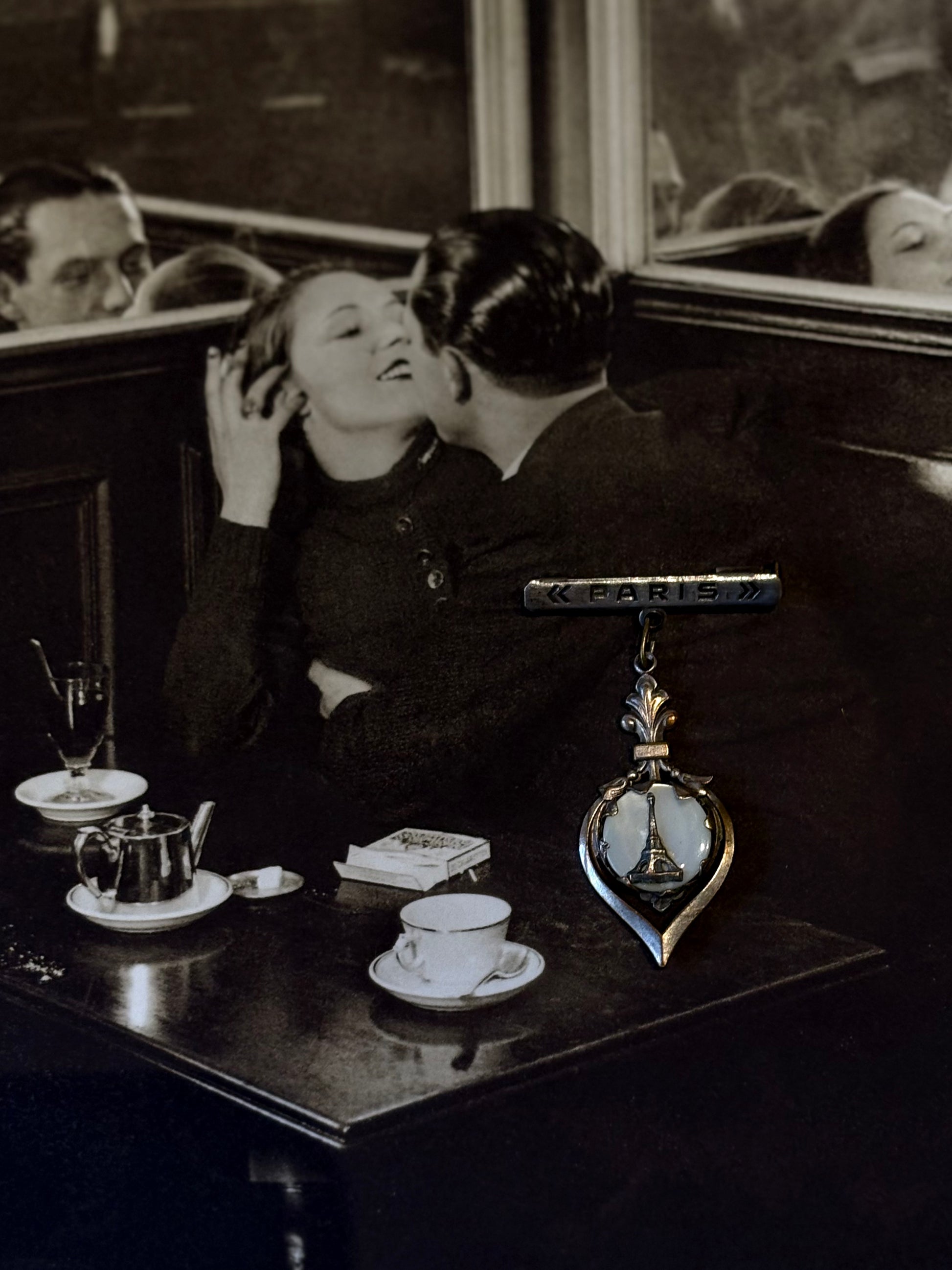 A delicate vintage Paris souvenir brooch featuring a silver bar inscribed with “PARIS,” from which hangs a small heart-shaped charm framed by a fleur-de-lys. Inside, the Eiffel Tower stands against a pale, pearlescent background: part romantic keepsake, part emblem of the city’s timeless allure. The kind of trinket once pinned to a travel coat, carrying a quiet whisper of Paris wherever it went.