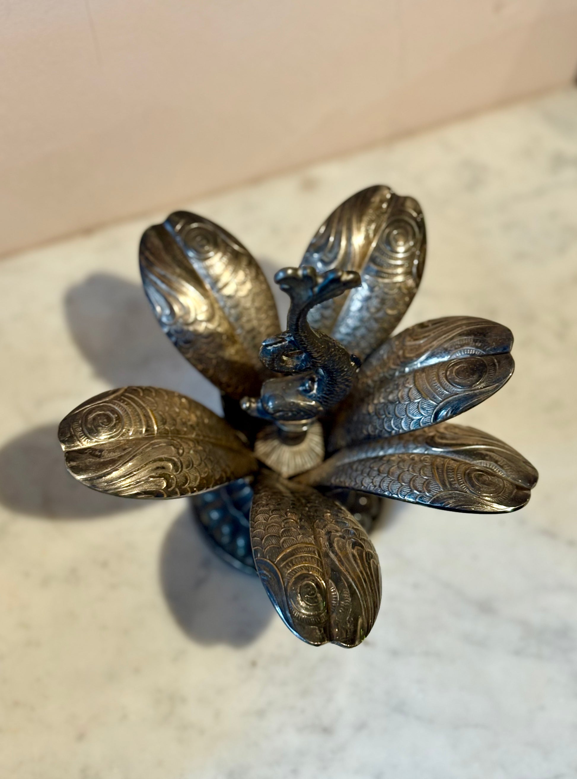A striking silver-plated Art Nouveau caviar server with a beautifully sculptural, aquatic design. A fantastical sea creature rises from an open water lily, its curling tail framed by gently unfurling petals that form individual serving wells. Rich in the flowing lines and nature-inspired motifs of the Art Nouveau period, the piece is finely detailed with scale and wave patterns and has developed a soft, attractive patina over time.