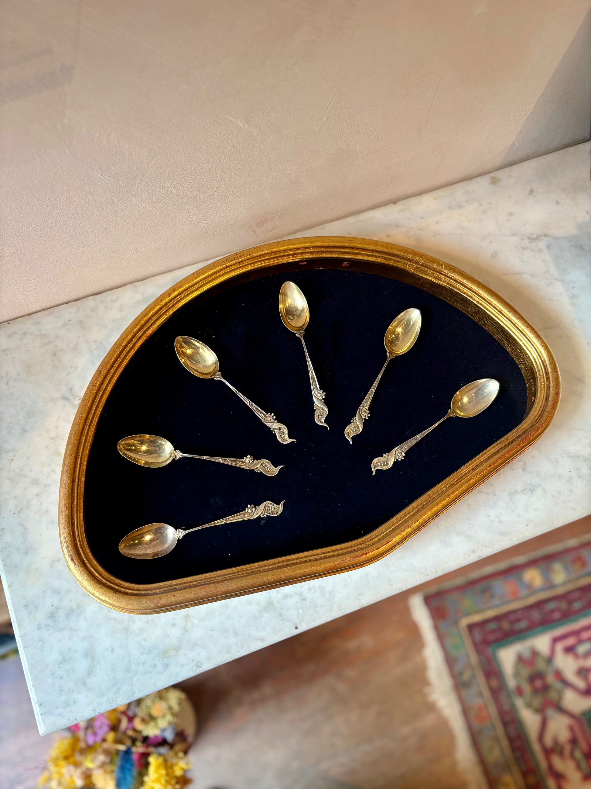 Vintage Venetian fan-shaped frame featuring six antique Italian silver-plated decorative spoons, beautifully mounted against deep navy velvet. A wonderfully unusual wall piece with elegant old-world charm.