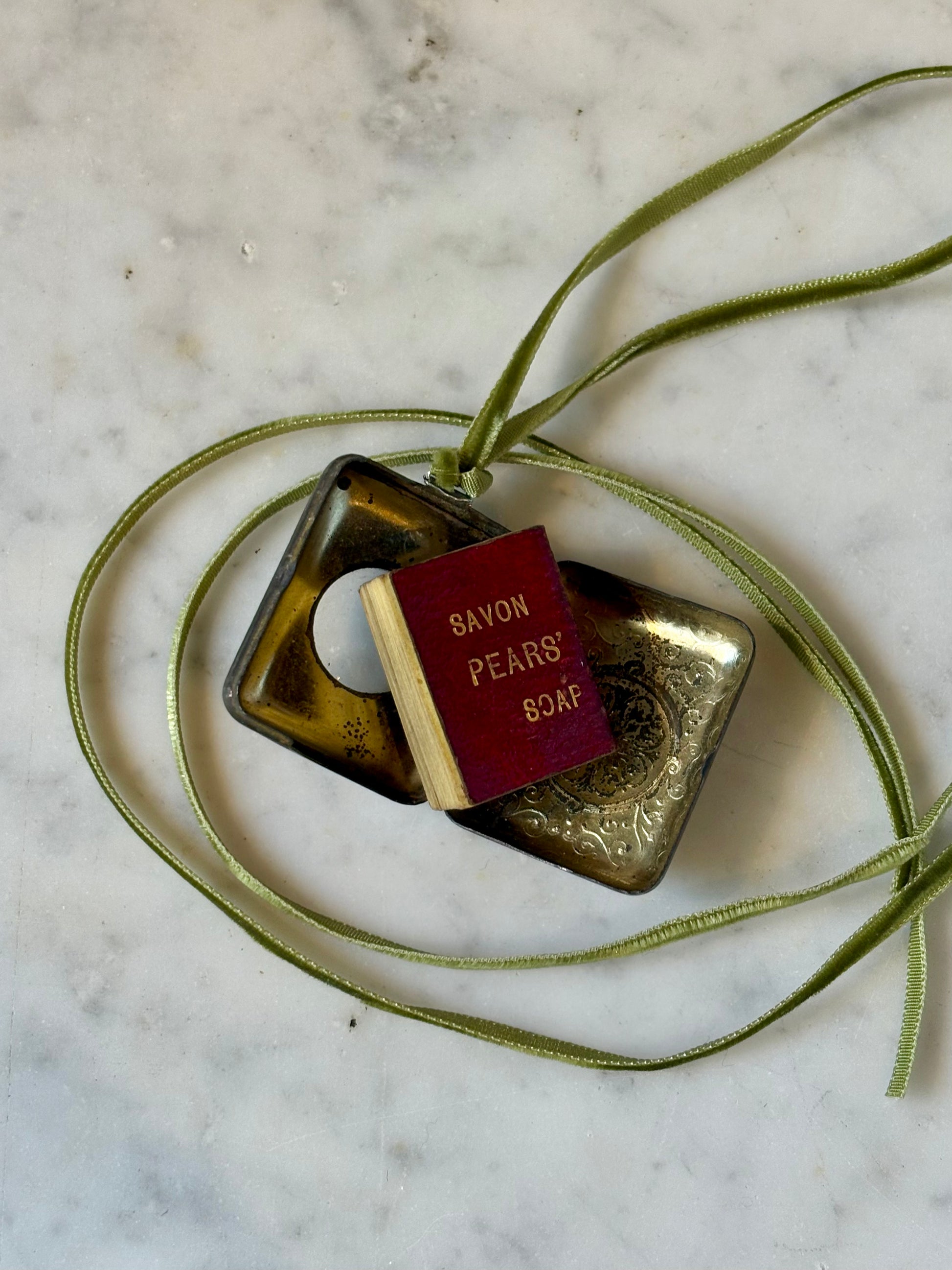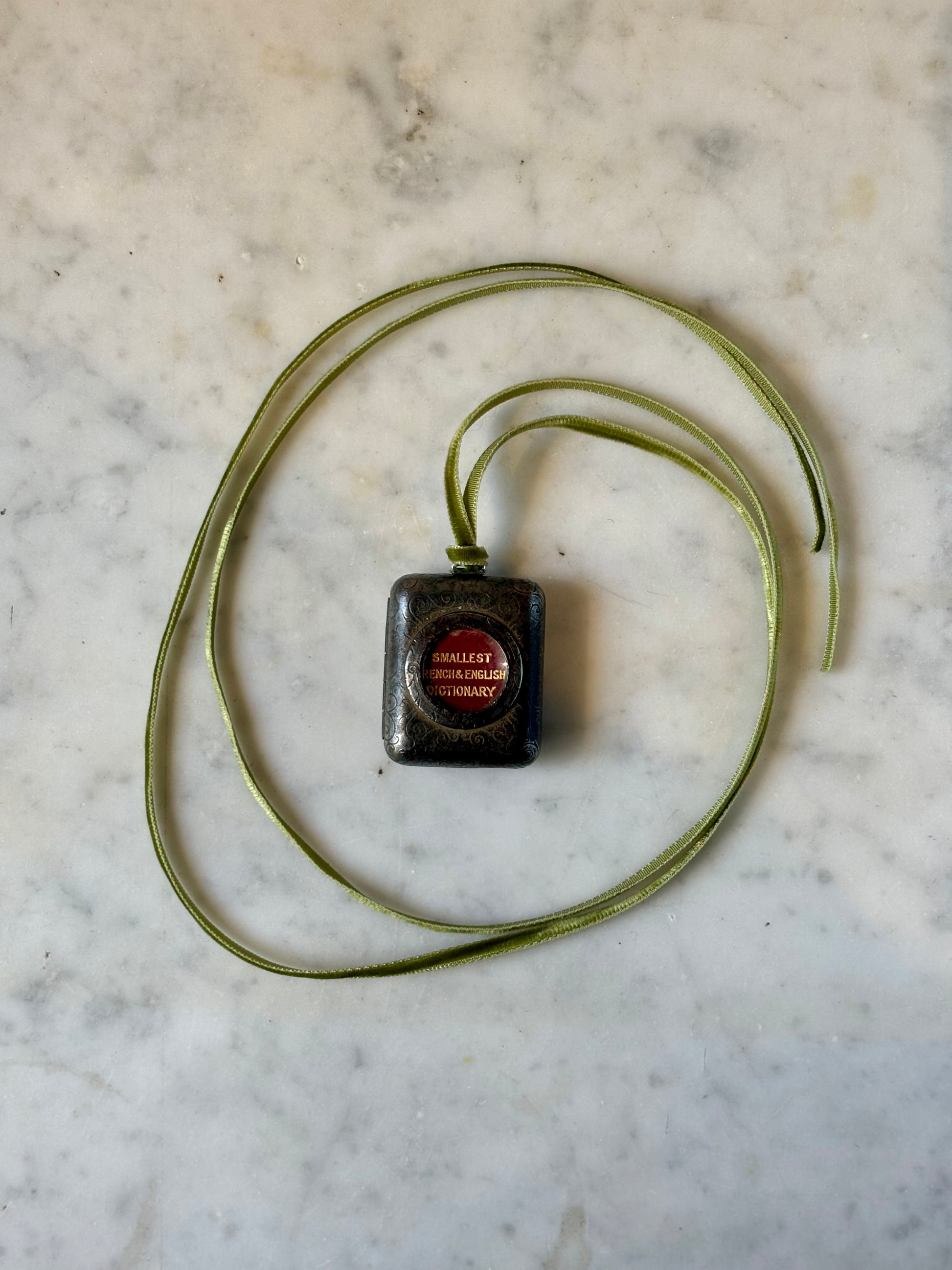 Bound in deep maroon leather and originally accompanied by its magnifying glass, this tiny book feels like something a Victorian traveler or secret-keeper might have carried in a waistcoat pocket. With a green velvet ribbon attached, it can be worn or carried anywhere—a tiny dictionary turned poetic companion for life on the move. Part curiosity, part craftsmanship, part quiet magic—proof that even the biggest ideas can live in the smallest of books.